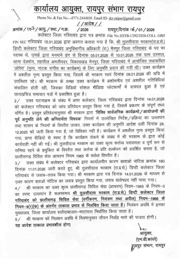 लेकिन आयोजन की अनुमति देने वाले और स्वयं अश्लील डांस का मजा लेने वाले एसडीएम तुलसी दास मरकाम के खिलाफ कार्रवाई से प्रशासन ने परहेज किया था. इस पर जब जनरपट ने सवाल उठाया तो प्रशासन में हलचल मची, जांच दल बिठाया और जांच रिपोर्ट सामने आने के बाद एसडीएम तुलसी दास मरकाम को निलंबित किया गया है.