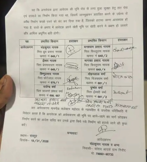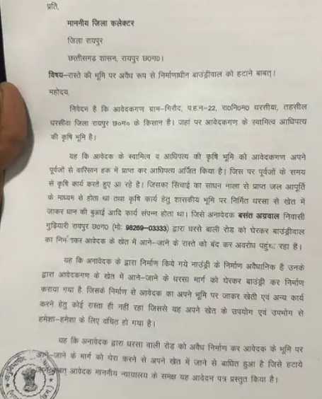 किसान अपनी शिकायत लेकर रायपुर कलेक्टर के पास भी पहुंचे थे, अपने आवेदन में उन्होंने कहा है कि खेती और सिंचाई का काम नाले से मिलने वाले पानी और शासकीय धरसा मार्ग के जरिए होता था। आरोप है कि बसंत अग्रवाल ने धरसा वाली सड़क को घेरकर बाउंड्रीवॉल का निर्माण कर दिया, जिससे खेतों तक पहुंचने का एकमात्र रास्ता बंद हो गया। इससे किसान अपने खेत के उपयोग और उपभोग से पूरी तरह वंचित हो गए हैं। किसानों ने अवैध निर्माण हटाकर रास्ता बहाल करने की मांग की है।